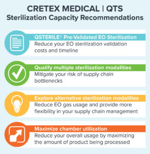Cretex Medical | QTS has implemented strategies to mitigate sterilization facility capacity constraints. First and foremost, Cretex Medical | QTS has launched a pre-validated EO cycle called QSTERILE®. While traditional EO validations can be very costly and take significant time, a lot of the legwork for the QSTERILE® validation is already done. Because only product-specific elements of the validation need to be conducted, QSTERILE® can cut the EO validation timeline by more than half. This ensures a validated sterilization process while offering significant cost reductions in comparison to a full EO validation.
