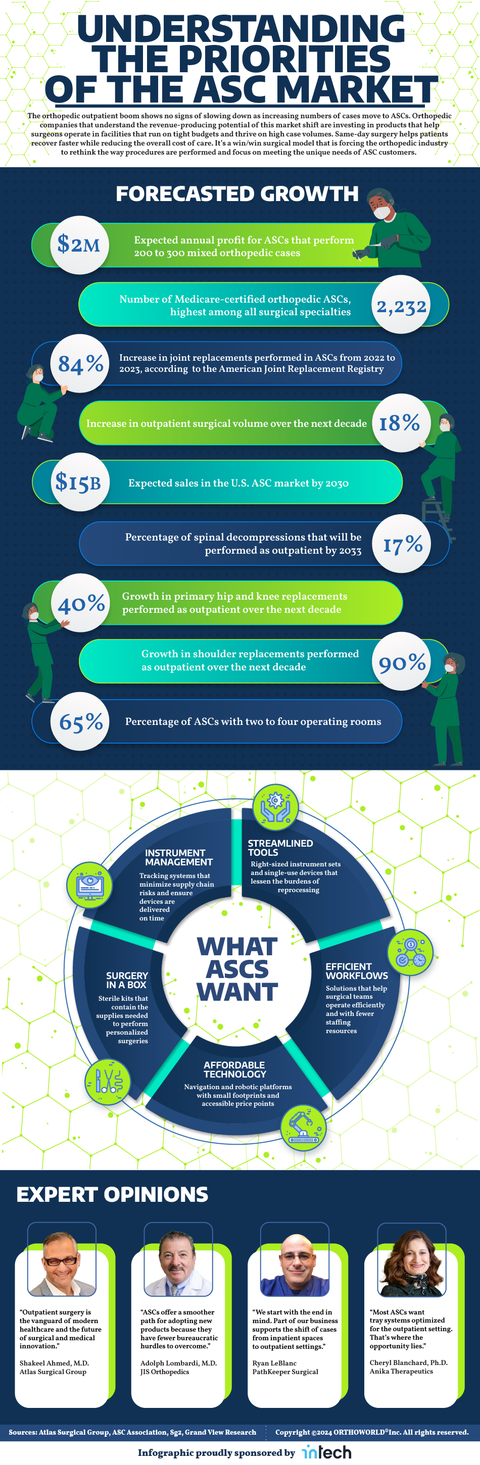 The movement of orthopedic cases to ASCs is on an upward trajectory and is expected to remain in constant growth mode over the next decade. Orthopedic companies recognize the site-of-care shift and are developing products with smaller surgical footprints that contribute to improved patient outcomes, streamlined workflows and cost-effective care.