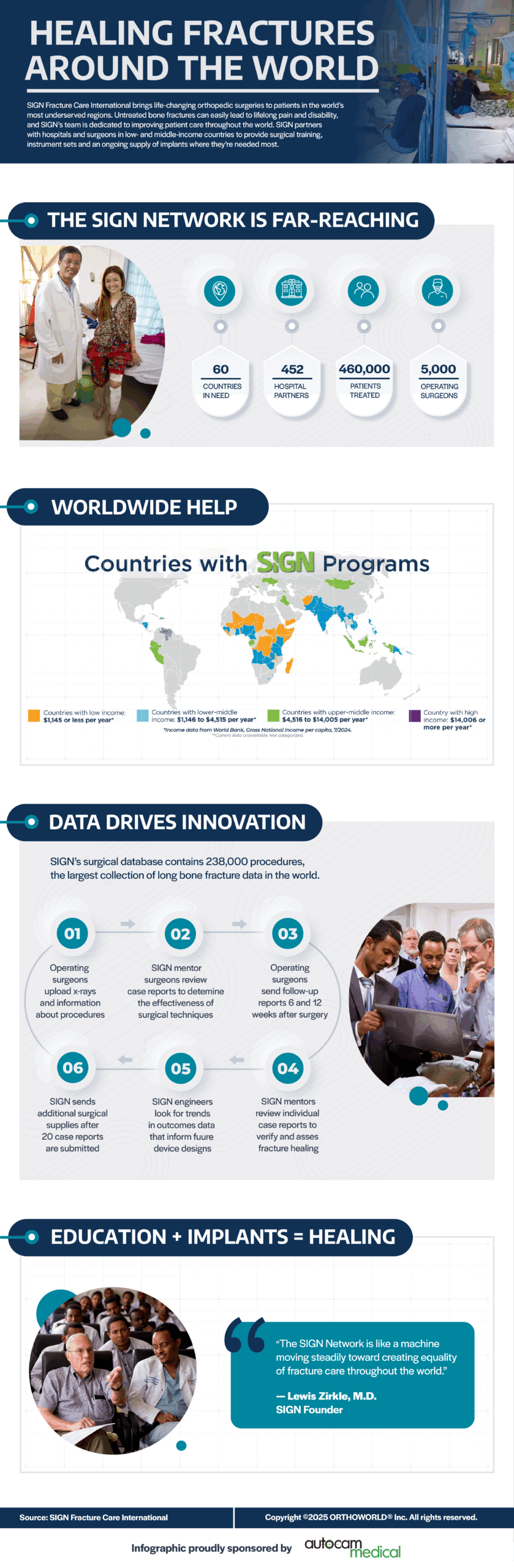 SIGN Fracture Care International is a humanitarian organization that donates education and implant systems to surgeons in developing countries and low-resource hospitals. It’s the passion project of Lewis Zirkle, M.D., SIGN’s President, Founder and Chairman, that has evolved into a worldwide network of 452 hospitals in 60 countries. SIGN has cared for 460,000 patients since its founding in 1999.